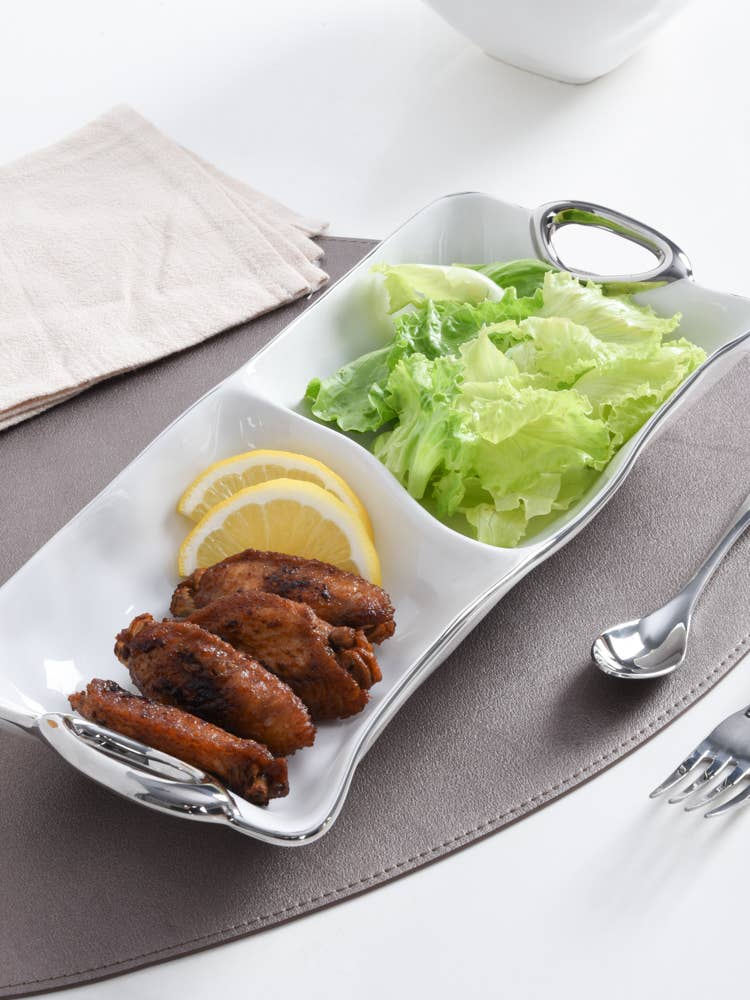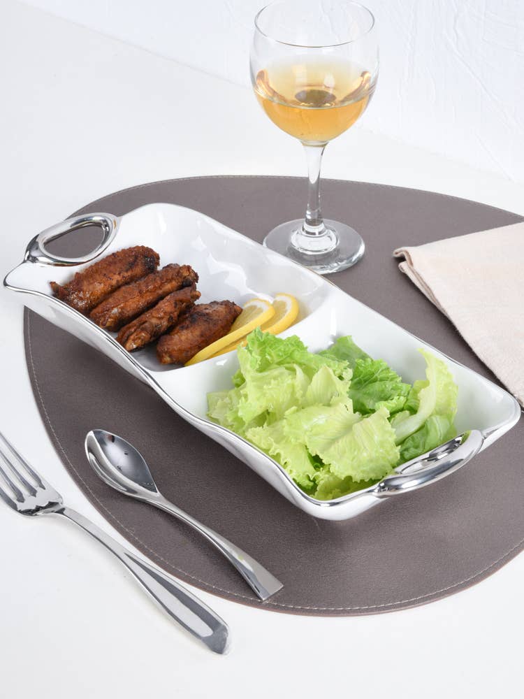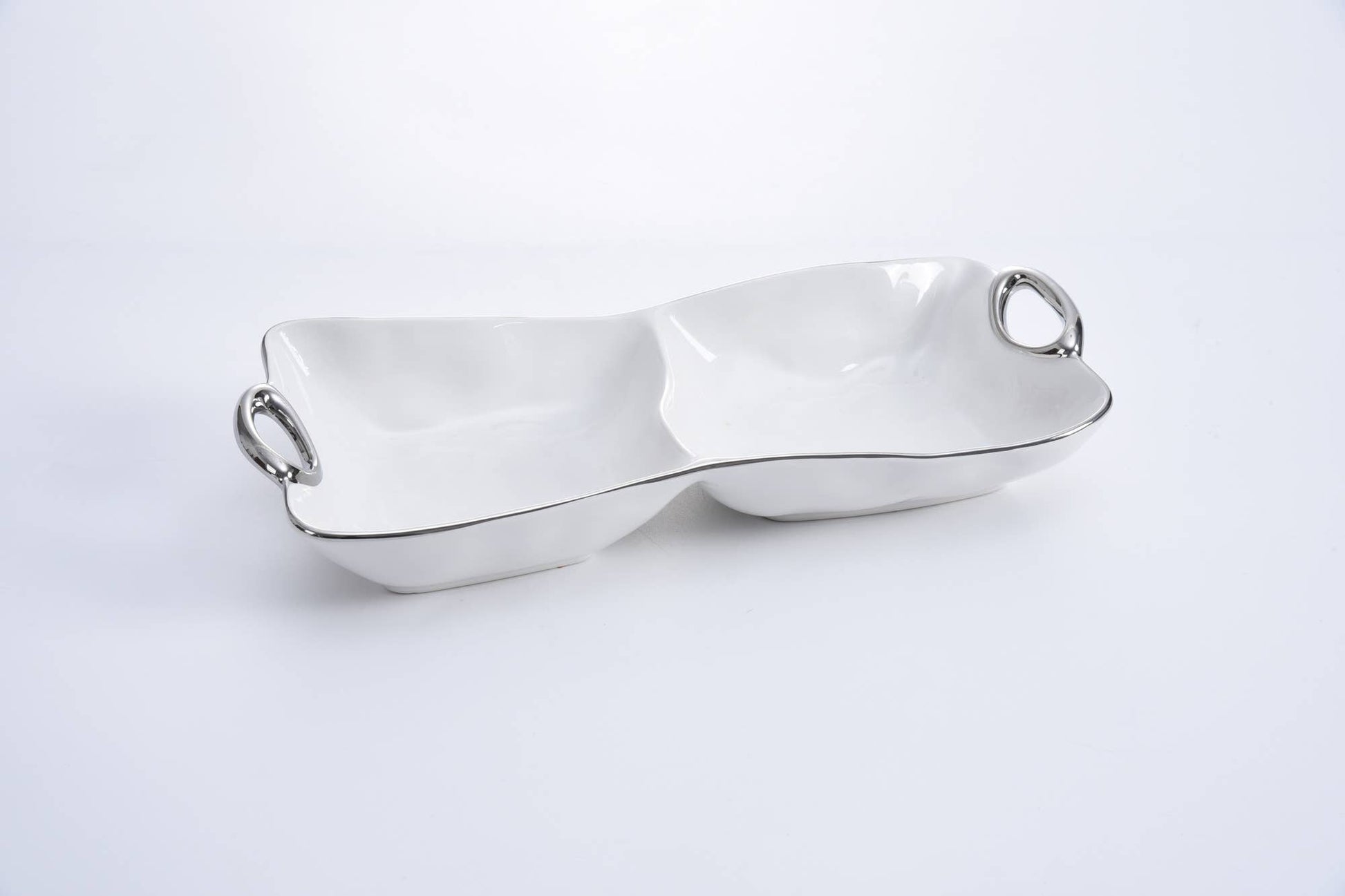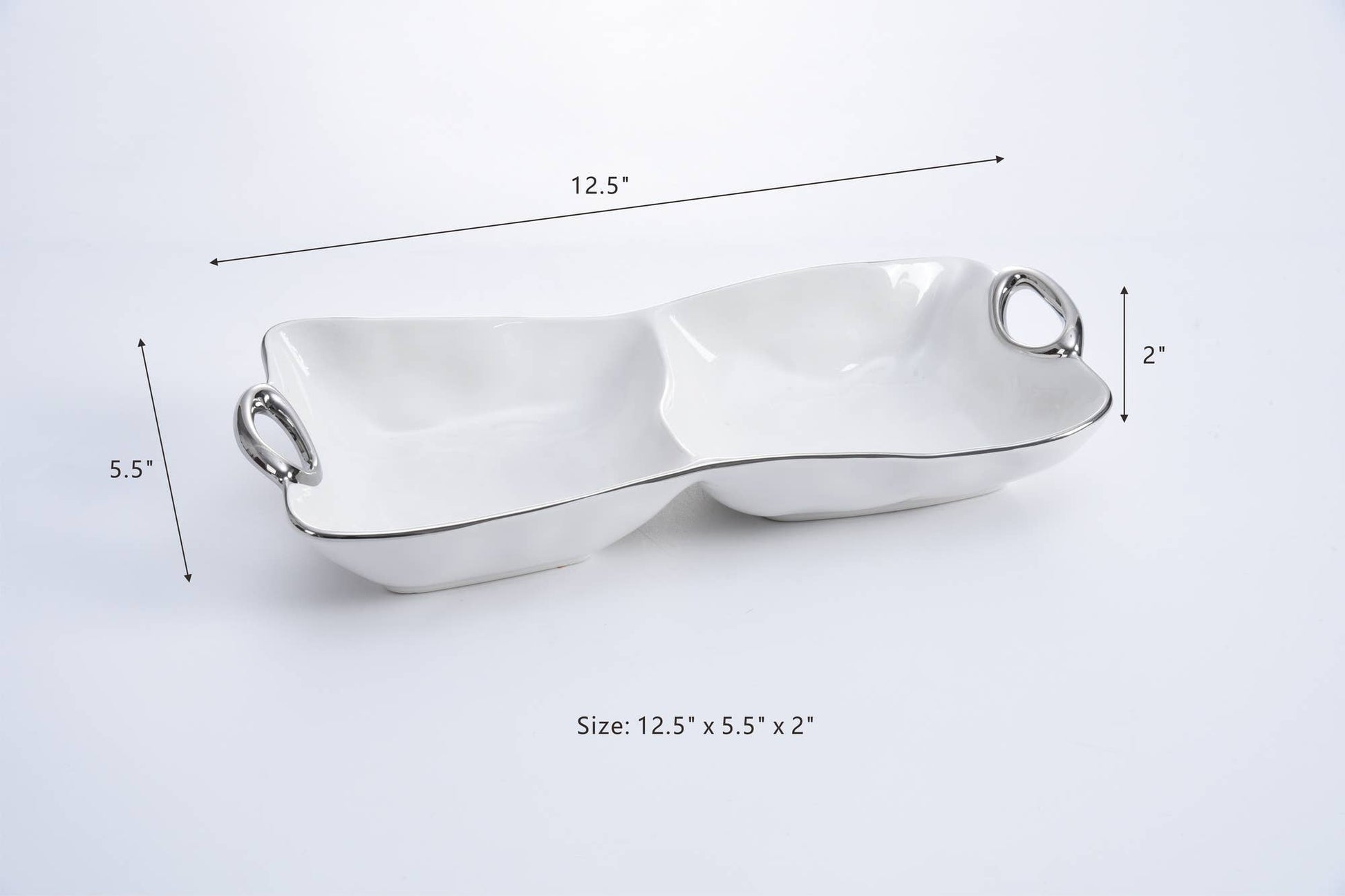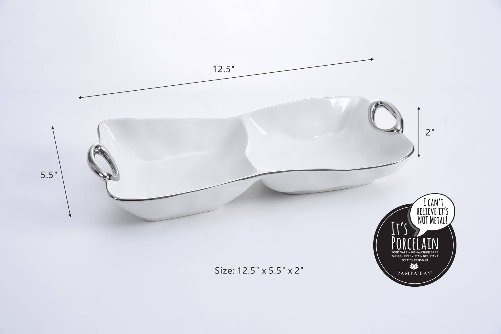 Two-section Server with silver trim and handles. Great for serving your favorite marinated salads! Can use for pulled beef and hummus or roasted veggies. Gorgeous white porcelain with smooth and fluent handles in silver titanium. Food safe, dishwasher safe, oven safe to 550°. Easy Care.