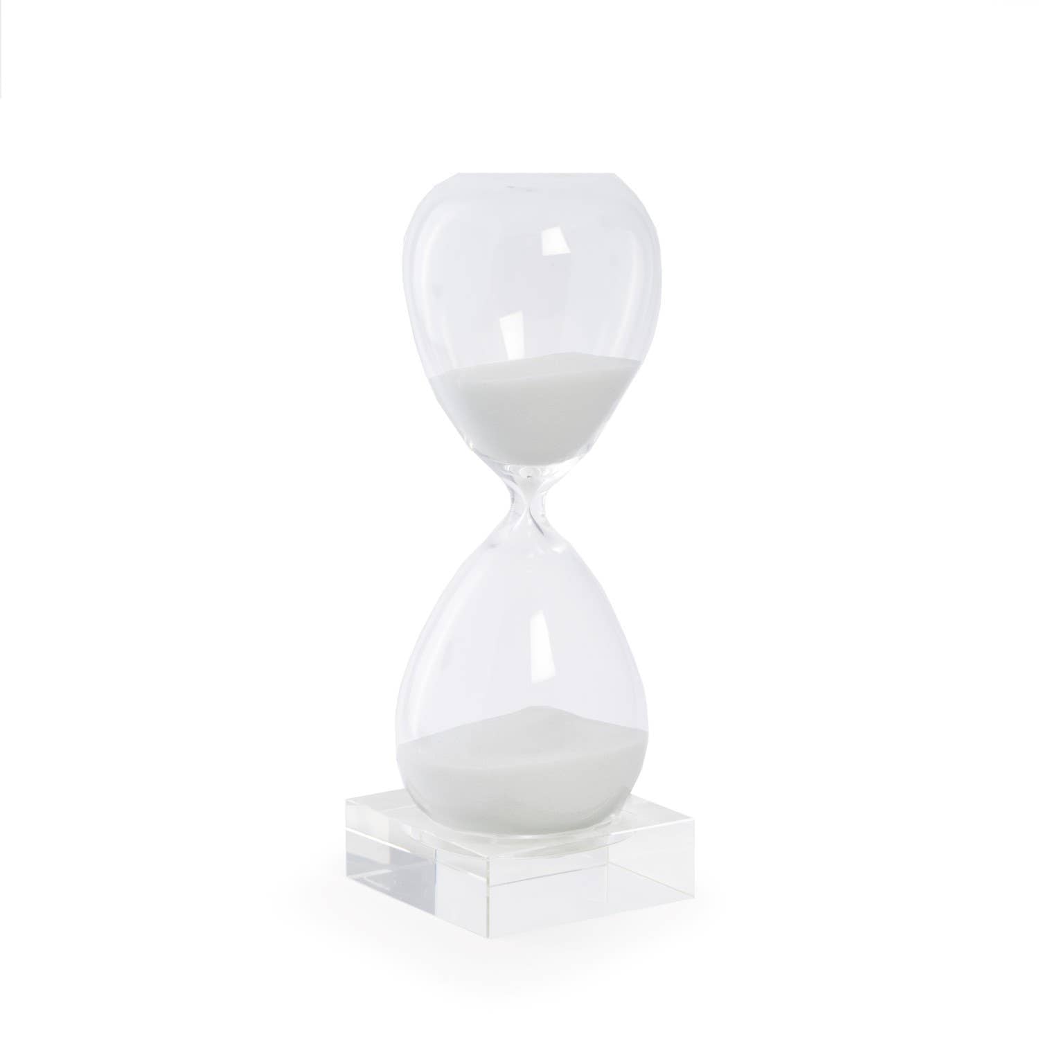 This hourglass timer is made of a unique crystal clear glass that allows you to see the beautiful flowing white sand. It’s unique design with no side columns and a clear base maximizes viewing from any angle. It’s attractive pure white sand will keep you mesmerized. Once started, the sand timer completes its run in 60 minutes. CLEAR/ WHITE on clear acrylic base