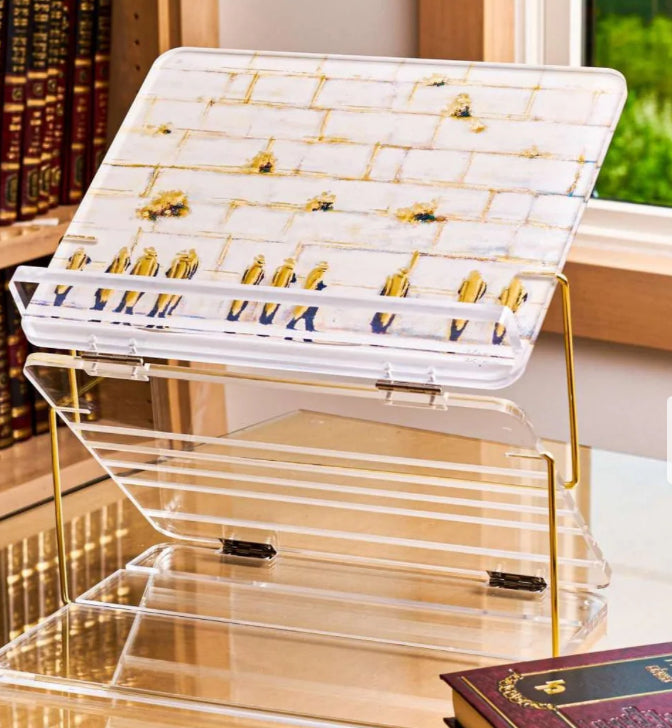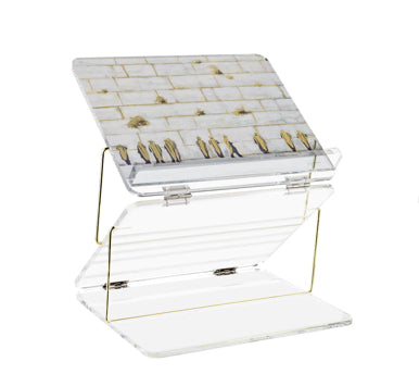 This high quality acrylic shtender stands above others in artistic appeal. It has gorgeous artwork of the kotel that has a three dimansional look on the acrylic. It has multiple heights and Adjustable positions.