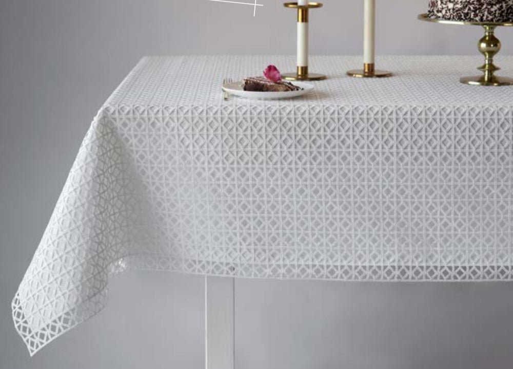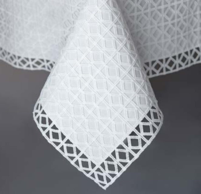This timeless elegant lined Diamond Lattice Tablecloth provides a classy backdrop for the most regal table scape. If Color is your preference, inquire about ordering this gorgeous cloth unlined and pairing it with one of our colored linen liners (sold separately). This cloth is available in a multitude of sizes with special order. Contact the store directly to order your size.