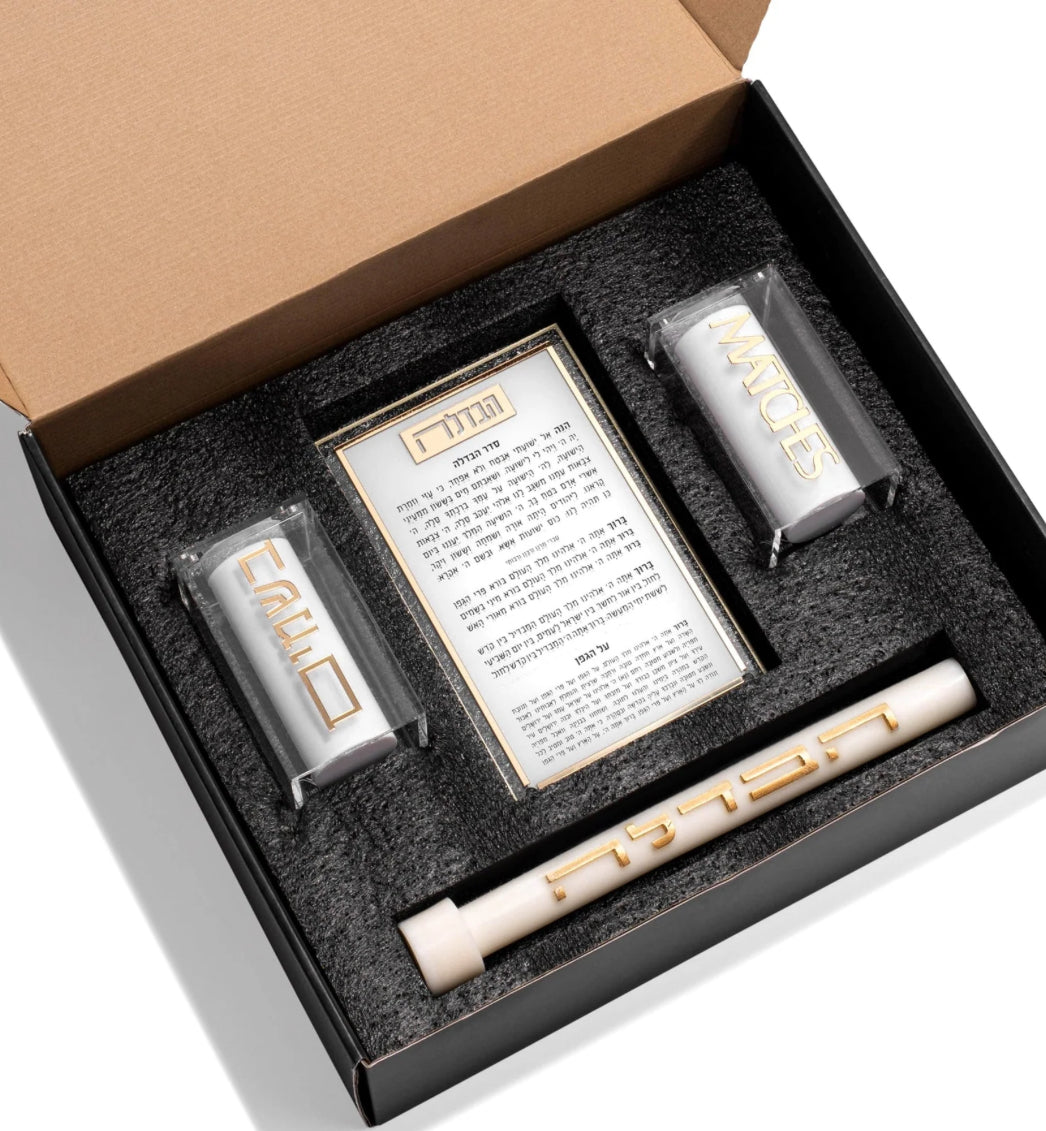 This gorgeous Havdala Set is the perfect housewarming or wedding gift. Or, simply gift yourself this updated modern clean Havdala set. This set includes magnetic closure Match Canister and Cloves Canister, Standing Prayer Card with Al Hagefen and a cylindrical Havdala Candle.