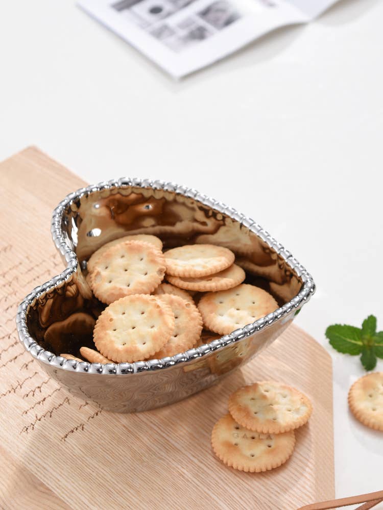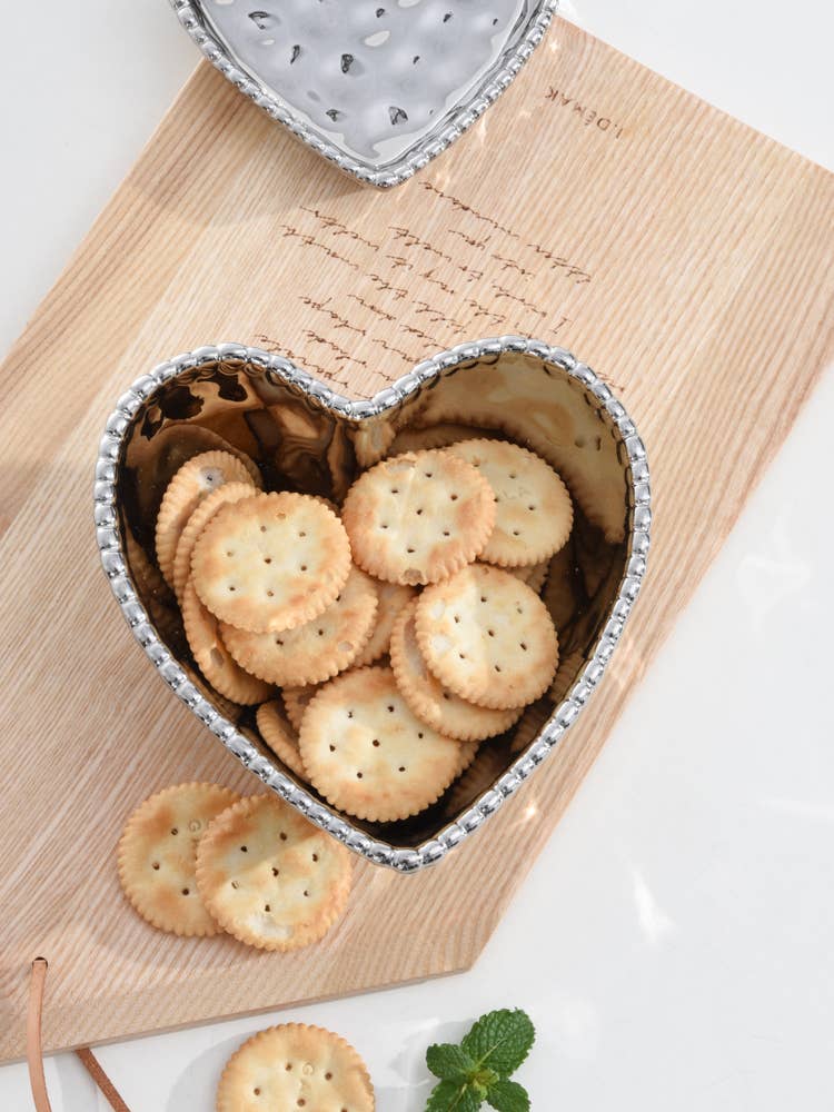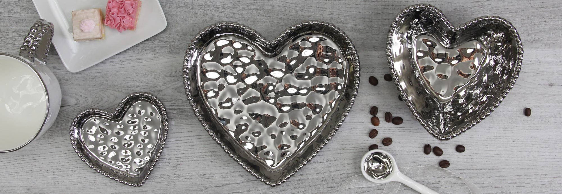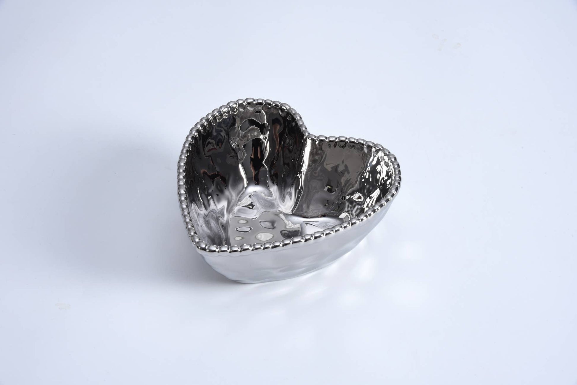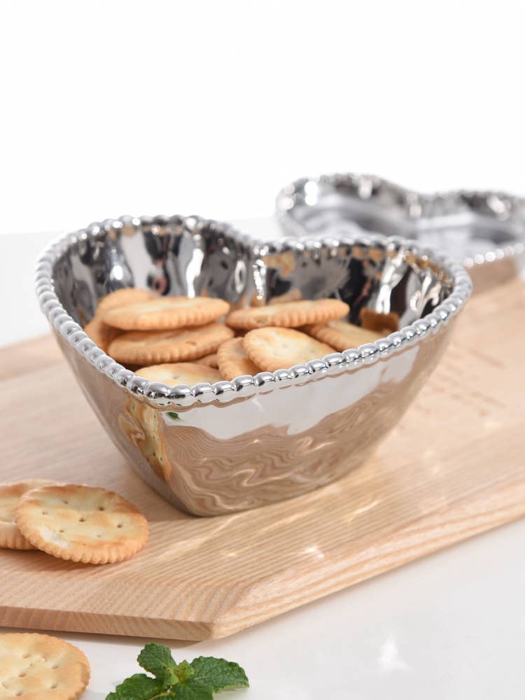 Heart Bowl Silver from our Love is in the Air Collection. Perfectly sized to serve candy or bite sized treats at your next party. A great addition to any vanity or dresser for jewelry. This heart dish would make a great Valentine’s Day, Mother’s Day or birthday gift! Show someone you “heart” them with this delightful dish. Crafted in stunning silver titanium finish with lustrous beads. Food safe, dishwasher safe, oven safe to 550°. Easy Care.