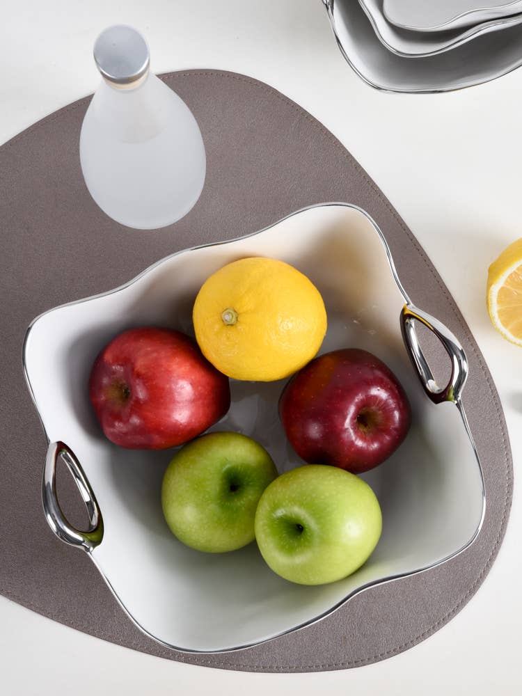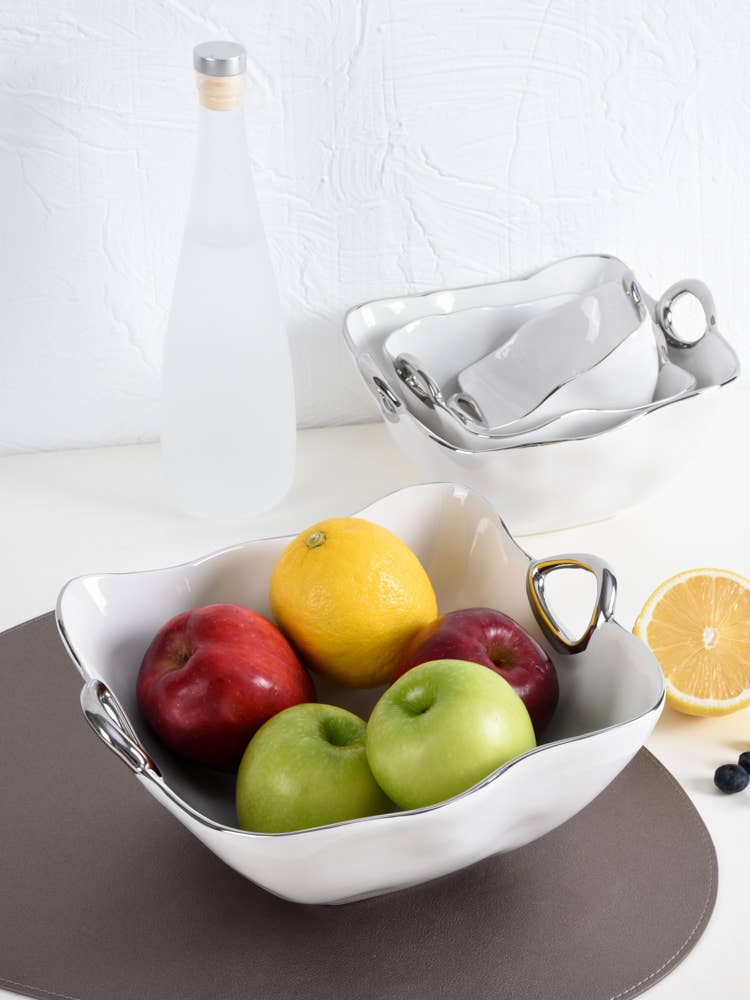 Large Bowl with silver trim and handle. Generously sized bowl for serving salads, pastas or side dishes. Stunning white porcelain with smooth and fluent handles in silver titanium. Food safe, dishwasher safe, oven safe to 550°. Easy Care.