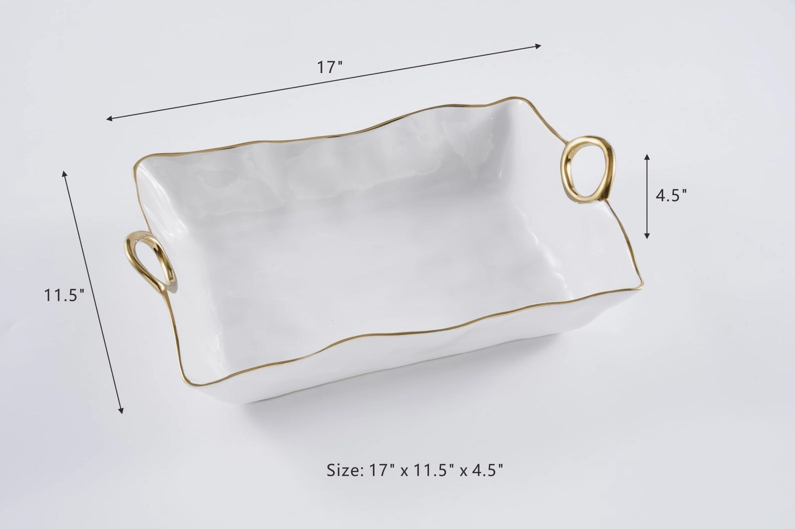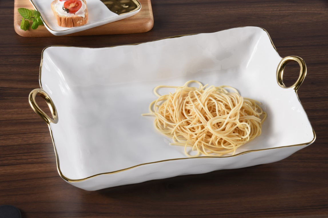 Masterfully entertain your guests with the Large Deep Server. This elegant, white server with gold accent handles seamlessly transitions from the oven to your dining table. Its size and design make it perfect for large gatherings, while adding a touch of sophistication to any occasion.