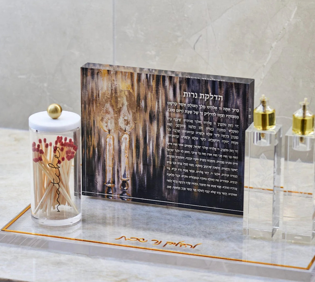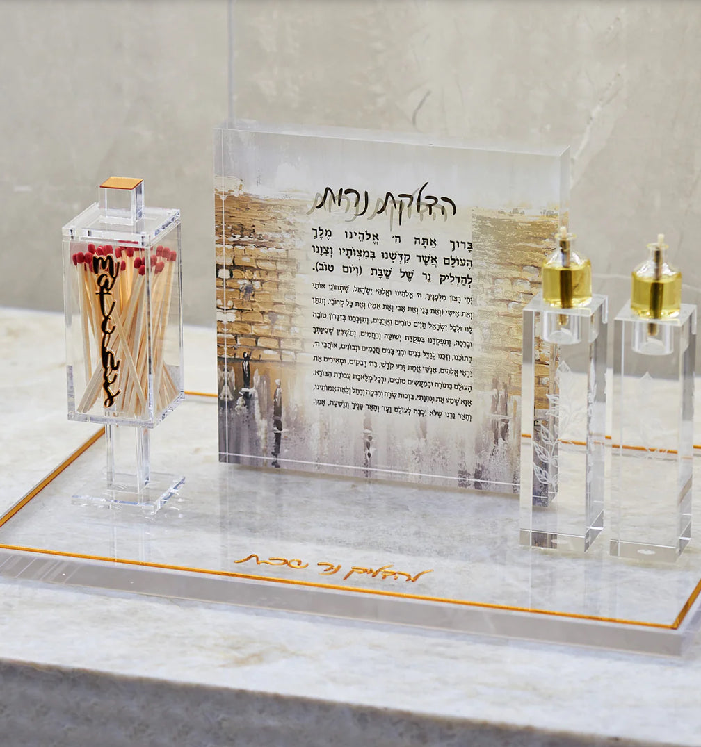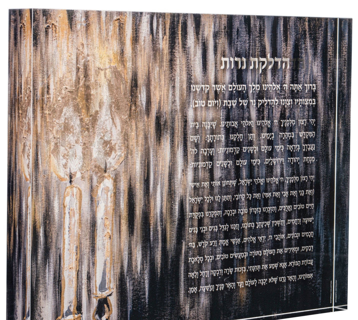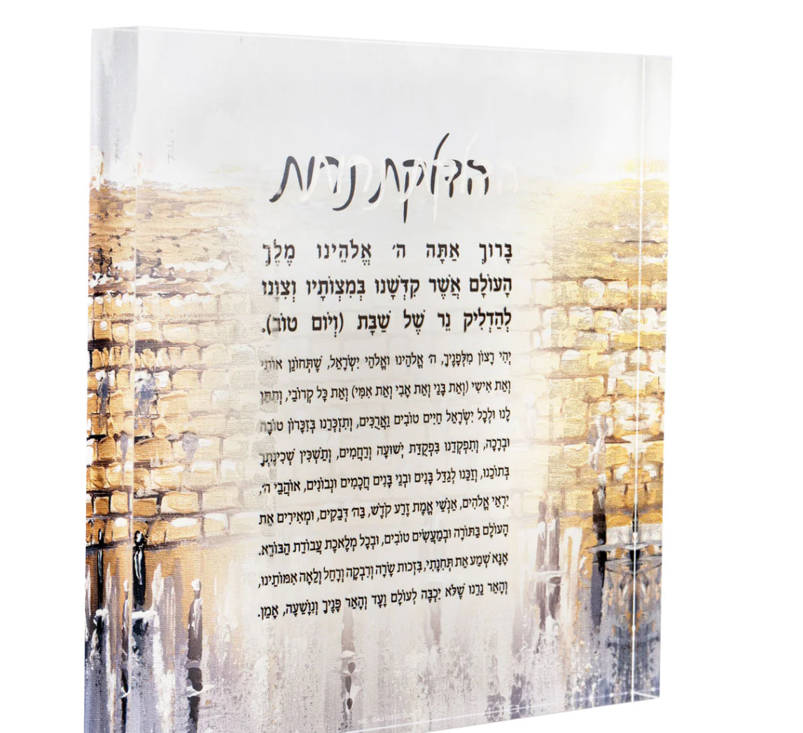 Bring beauty and meaning to your candle lighting display with this magnificently painted Kotel Hadlakas Neiros art piece. Substantial stand alone lucite block. Dimension 9”x7”