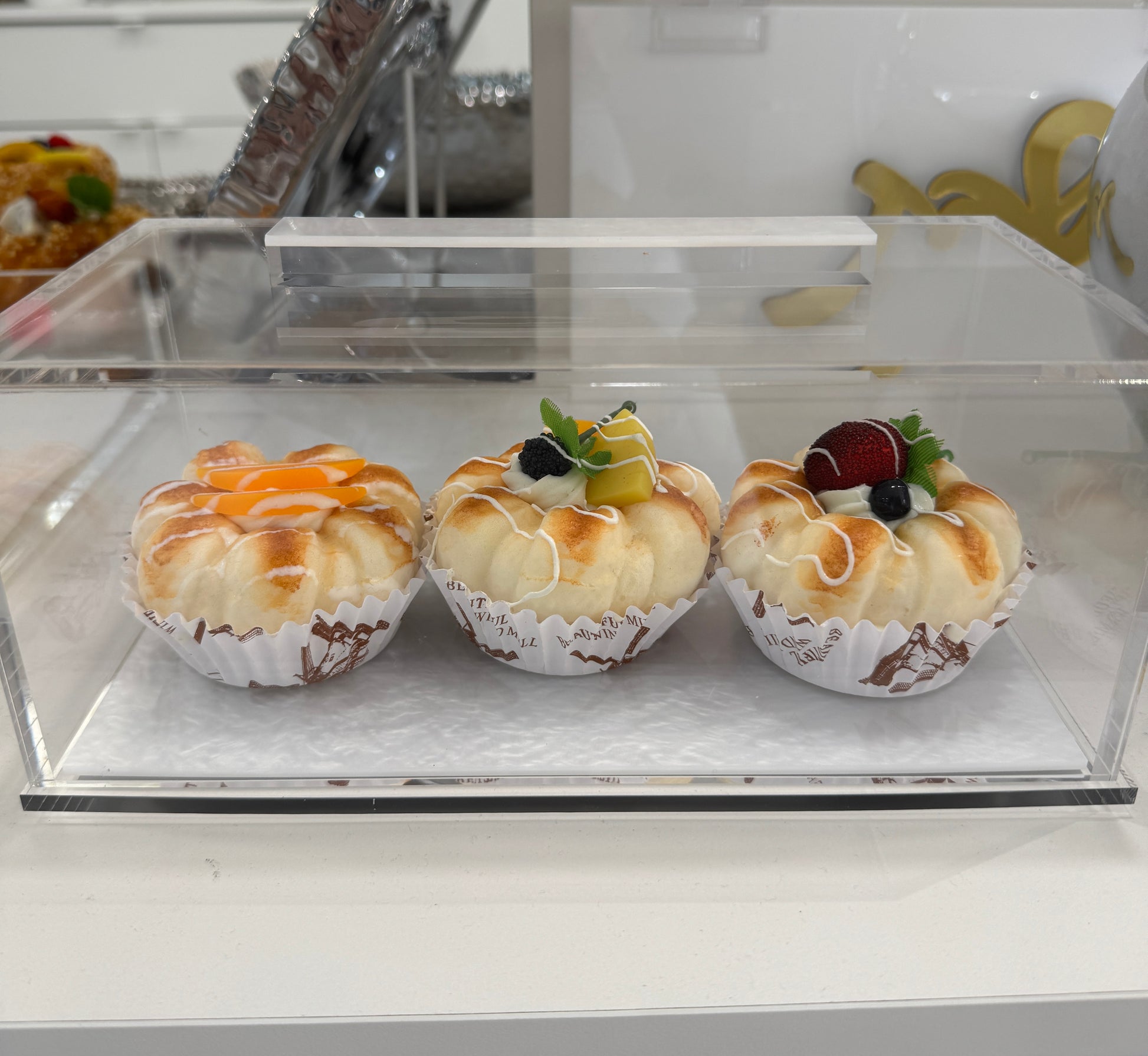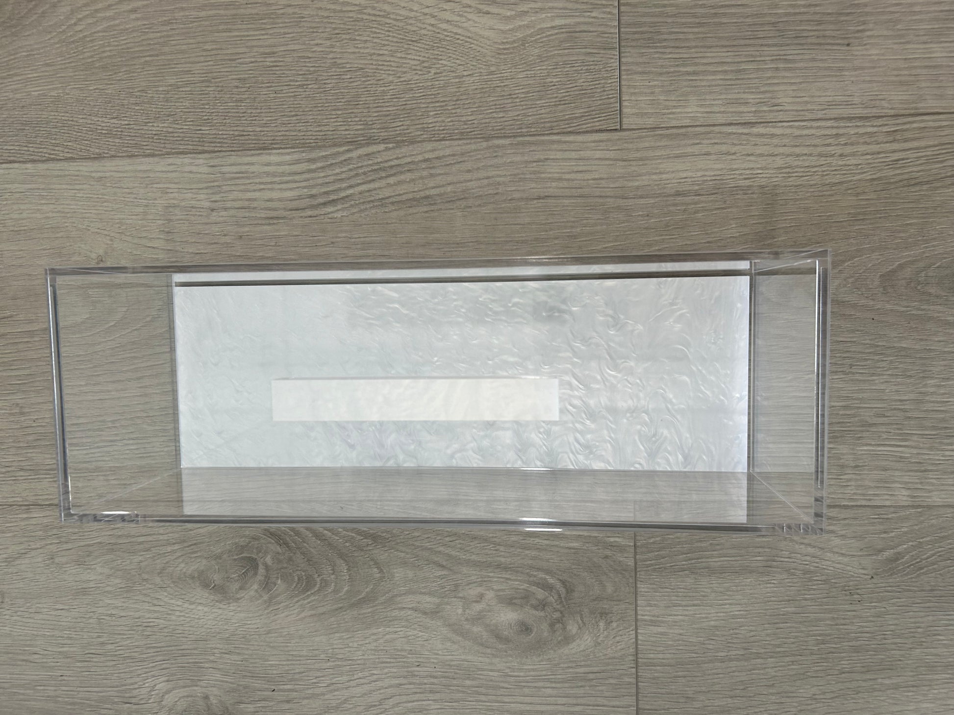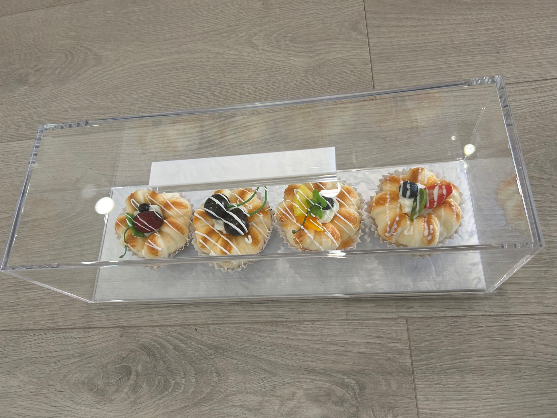 High quality rectangular acrylic cake dome. Pearlized base perfect for shadow casing all pastries elegantly. LARGE 15.5” W x 5.25 ” H x 5.25 D. SMALL 10 X 5 X 4.5