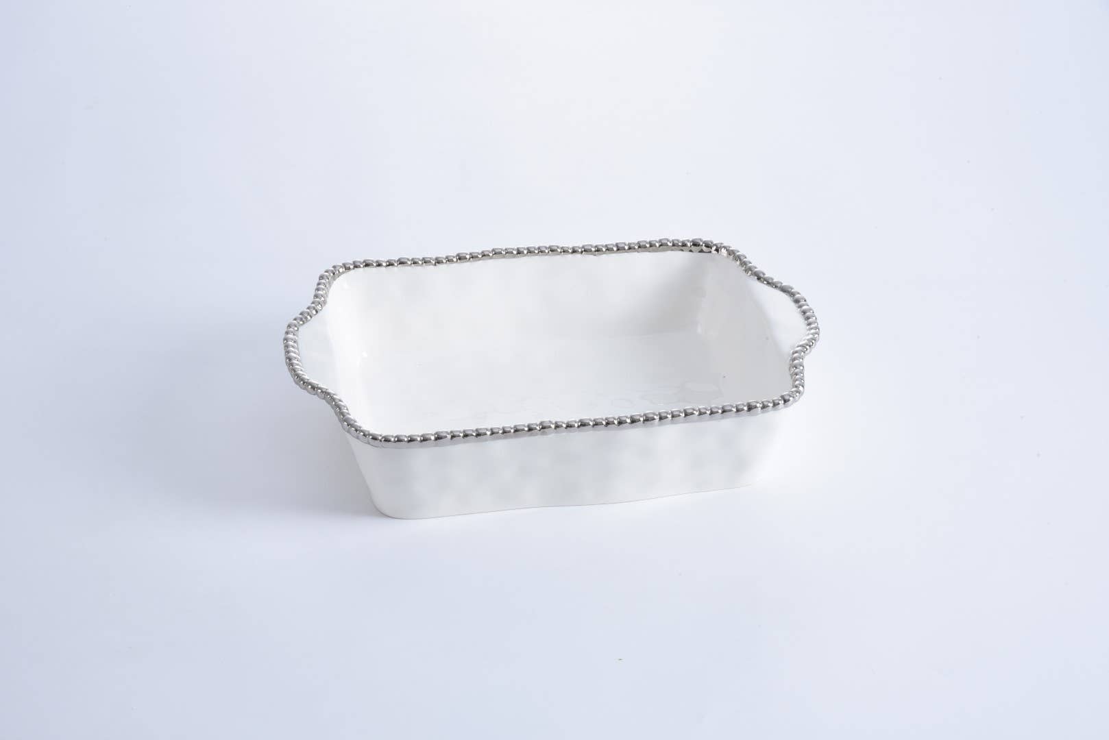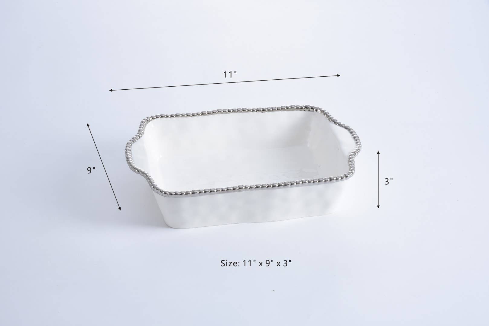 Rectangular Baking Dish is both pretty and practical. Impress with your culinary skill and presentation by serving up delicious entrees or pastries in these elegant dishes. Gleaming white porcelain with lustrous silver beads in titanium. Food safe, dishwasher safe, oven safe to 550°. Easy Care.