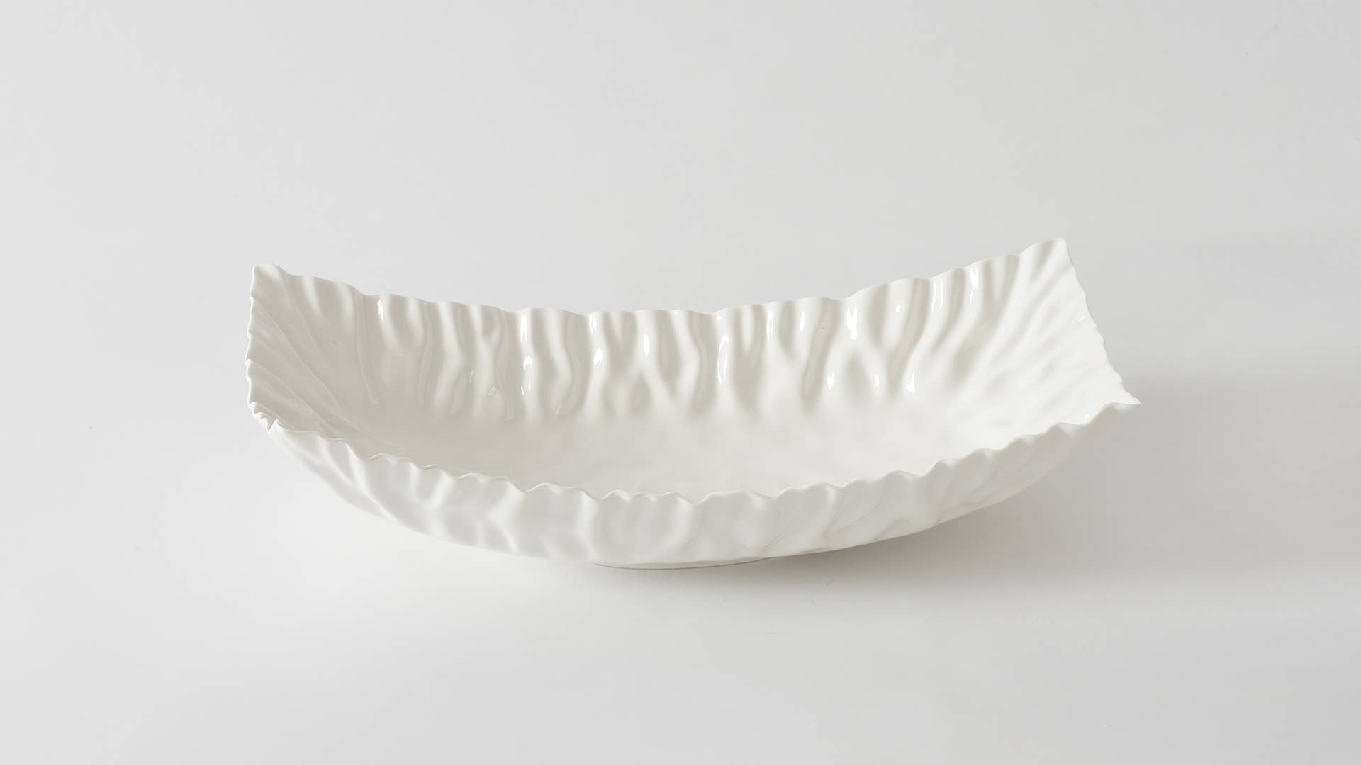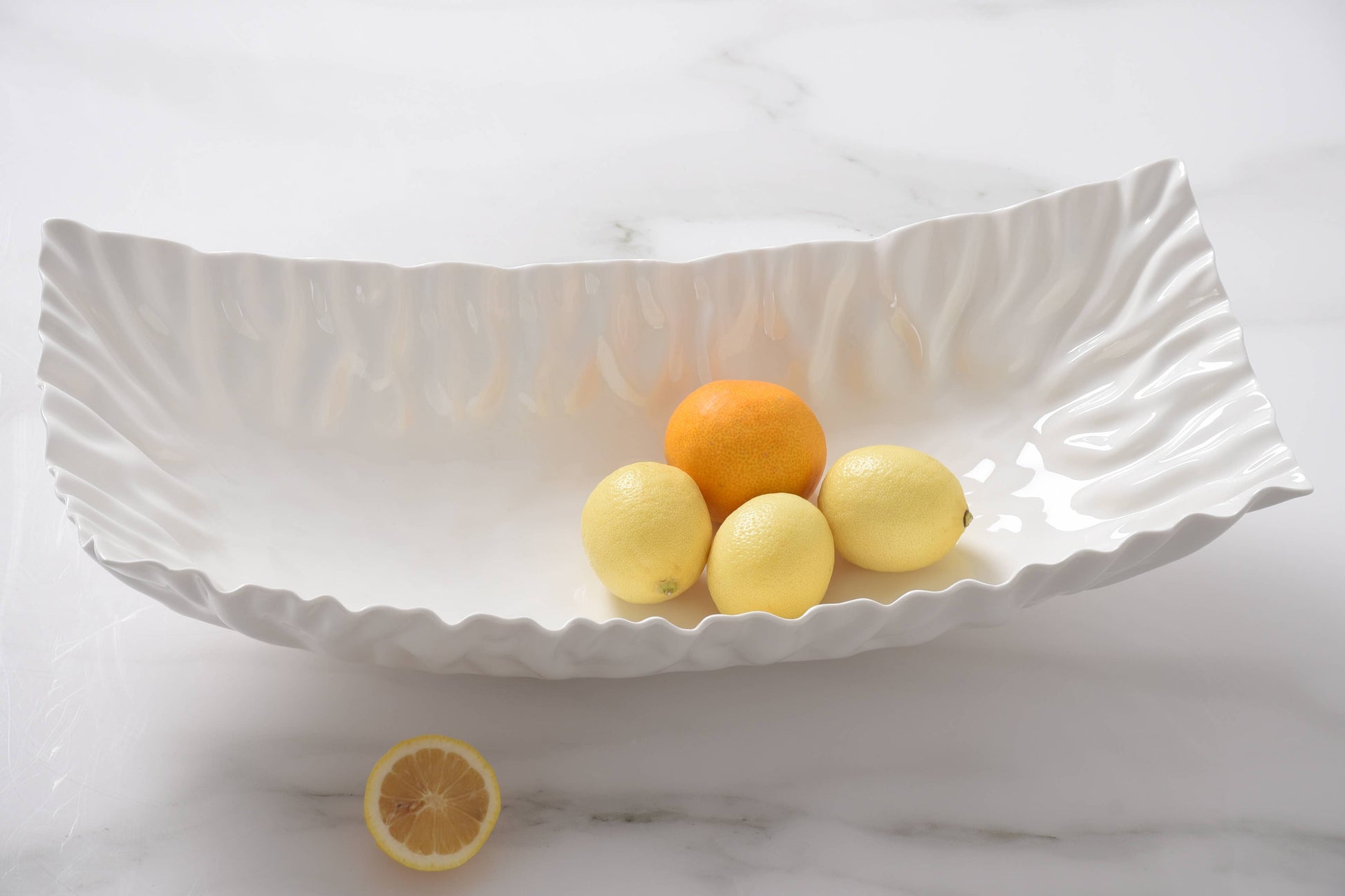 Rectangular Centerpiece in Mascali Bianca. Perfect for a gorgeous table focal point or for serving main courses and large sides! This all-purpose piece makes an easy transition from oven to table. Versatile high-fired porcelain pieces that are microwave safe! Food safe, tarnish free, dishwasher safe, oven safe to 500°. Easy Care.