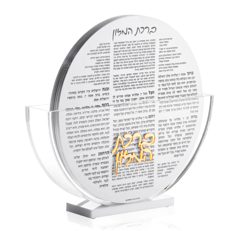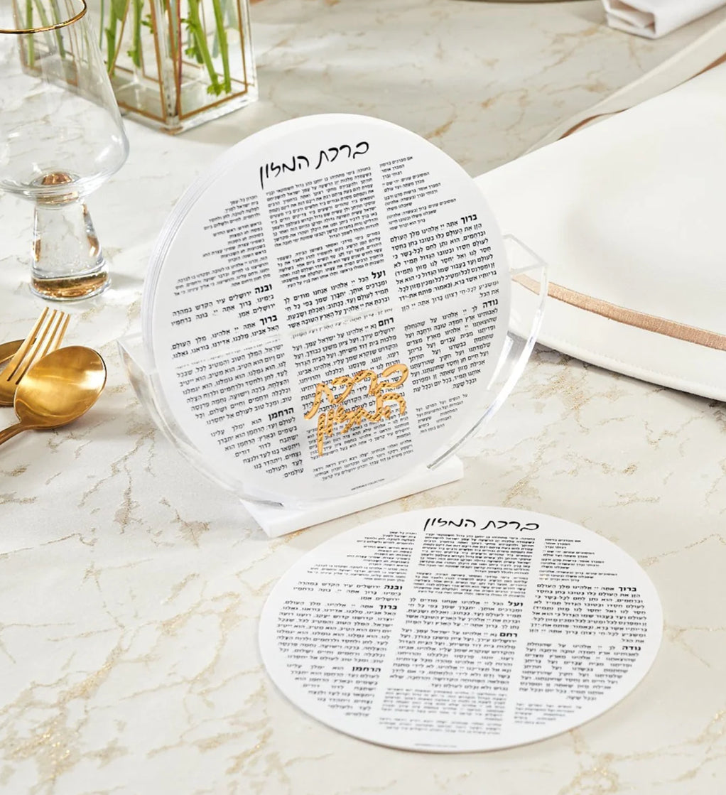 Luxurious white round lucite Bencher plaque cards in a modern round clear holder with gold mirrored label. White lucite is double sided with benching on one side and bracha acharona on the other. Easy to read. Wipe clean. Set of 6 cards. Fits up to 12. Dimension: 7.5” round.