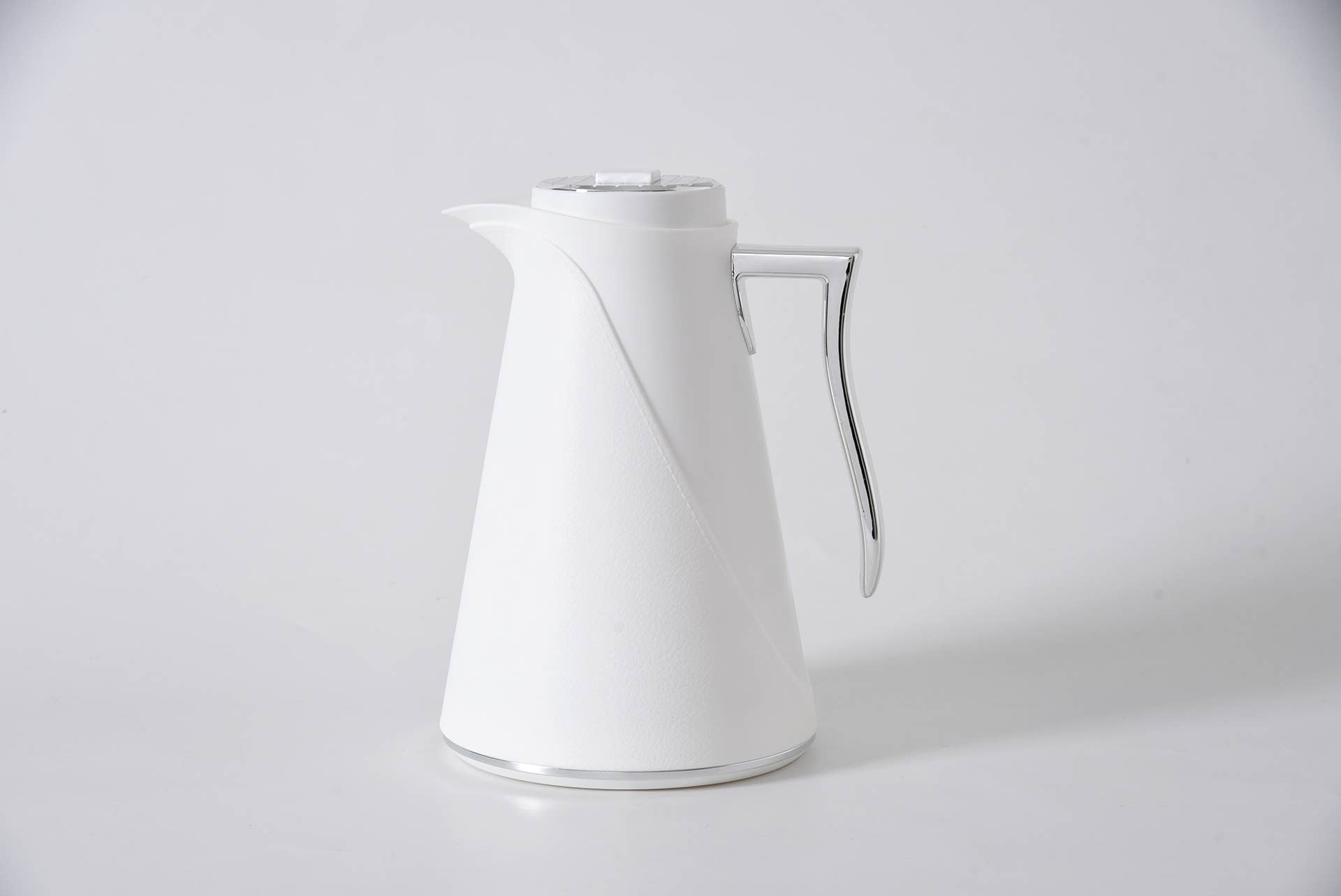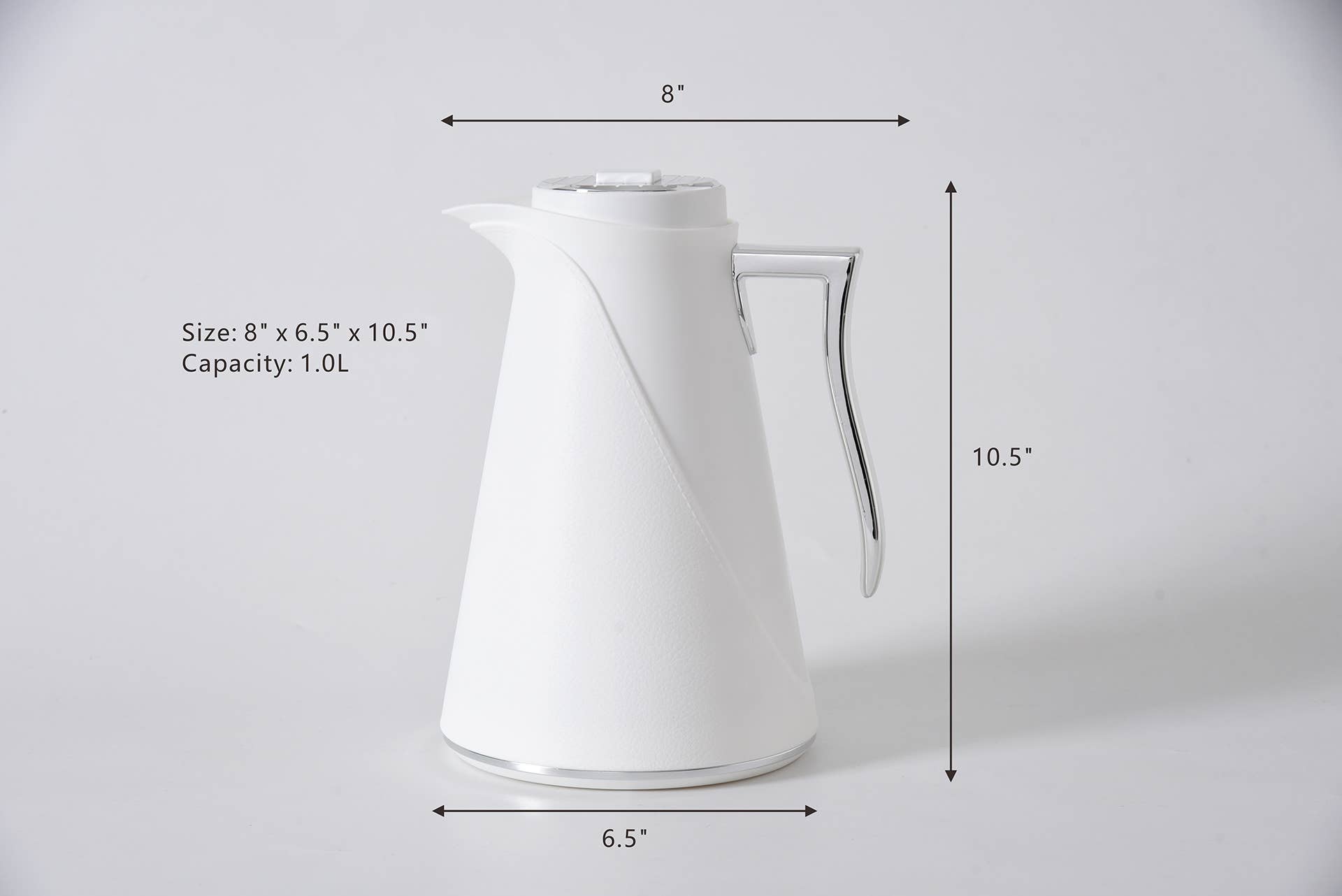 This Textured Thermal Carafe was crafted using vacuum insulation technology - keeping your beverages hot for up to 12 hours or cold for up to 24 hours. Featuring a sleek and modern design, this thermal beverage dispenser not only looks great on your table but also functions as a practical and convenient solution for serving hot or cold drinks. Crafted with a high-quality white body with silver detailing and unqiue pink glass inner lining. Handwash Only. Capacity: 1L